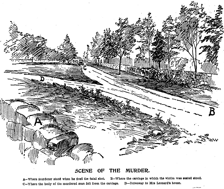 More bullets soon followed. One grazed Livingston’s cheek, another the low branches above the mens’ heads. Livingston, Cox, and Nichols retreated as the gunfire continued, readied their weapons, and fired. Livingston’s revolver jammed. Just then, they heard a cry, behind them. Nichols turned to see that their horse had retreated, pulling their wagon several yards further down Lexington Road. Their horse pranced uneasily and one particularly strong jolt pushed Foster from his seat, to the ground below. Nichols ran to his aid, but found him dead.