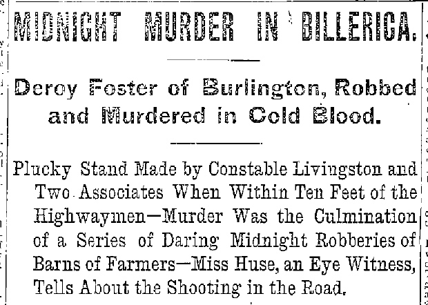 - “The Murder of ’94 Caused Great Excitement Out in Peaceful Billerica.” The Lowell Sun. [Lowell, Massachusetts] 3 Aug 1935: 5.