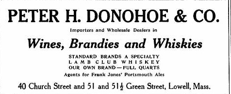 Another successful liquor store, Peter H. Donohoe & Co., located at 40 Church Street, sold wines, brandies, and whiskies to Lowell clientele until Prohibition.