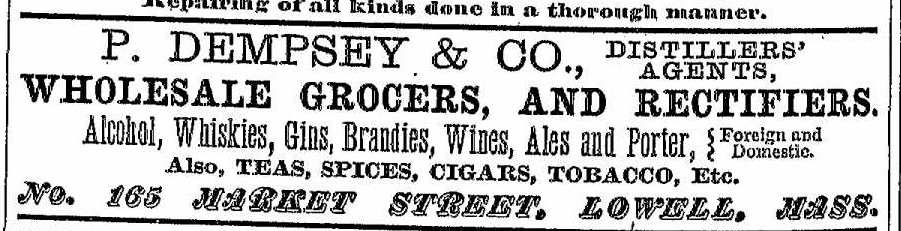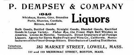 One of those merchants, P. Dempsey & Company Liquors, located in Lowell’s downtown area on Market Street, had origins in Lowell that dated to 1846, when it closed during Prohibition. The shop sold the “finest orange bitters”, creme de menthe, vermouth, and even Fisher Rye, the “Finest High Ball Whiskey in America”. Its advertisements appear on each side of this paragraph, 1915 at left; 1880, below. The Downtown Lowell landmark had closed by 1922, its location vacant.