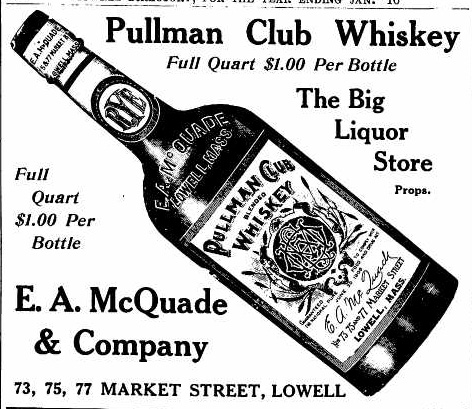 E. A. McQuade, another prominent Downtown Lowell merchant and the exclusive dealer of Pullman Club whiskey, had a successful enterprise located at 73-77 Market Street in Lowell in 1915, which was well-known locally as “The Big Liquor Store”.
