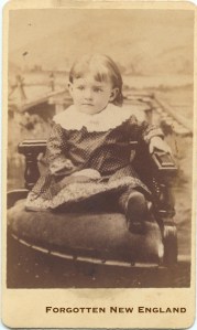 I looked at the other photographs, and came across this one, in a different box.  I recognized the background immediately – the bridge, the mountains.  And, that same shaggy carpet is on the studio’s floor.  I put the two photographs next to each and decided I had a match.  Both photographs came from the same studio, most likely.  I was even ready to assume they had been taken on the same day.  Why?  If you look very closely at the first photograph, above, you’ll notice in the extreme lower-right corner, the same chair that the child in the photograph at the right is sitting on.  The photographer didn’t quite succeed in moving it out of the picture.  So, the woman from 1888 had a two-year-old child.  But, I still hadn’t solved the mystery of where the photograph had been taken.  From what I knew about the branch of the family, the most likely choices were Lowell, Massachusetts or Manchester, England.  Of course, there was a chance that the photograph could’ve been taken somewhere else entirely.