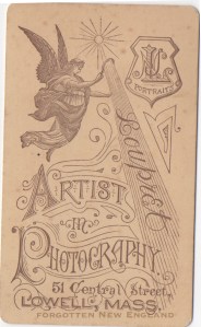 That’s when I found this carte-de-visite (CDV) photograph, at left.  Do you recognize the background?  I did too.  That’s even the same chair.  This game of matching was paying off.  On the back of the CDV was the photographer’s mark (right), which can be used to help date a photograph too.  Armed with a set of city directories, I quickly determined that the photographer, Napoleon Loupret was at 51 Central Street in Lowell, Massachusetts from 1885 to 1893.  Bingo – I had a probable date (1888 or so) and a city (Lowell, Massachusetts).  I also knew that I had a family, a woman, who was about 30 or so, who had children, born sometime between 1882 and 1890.