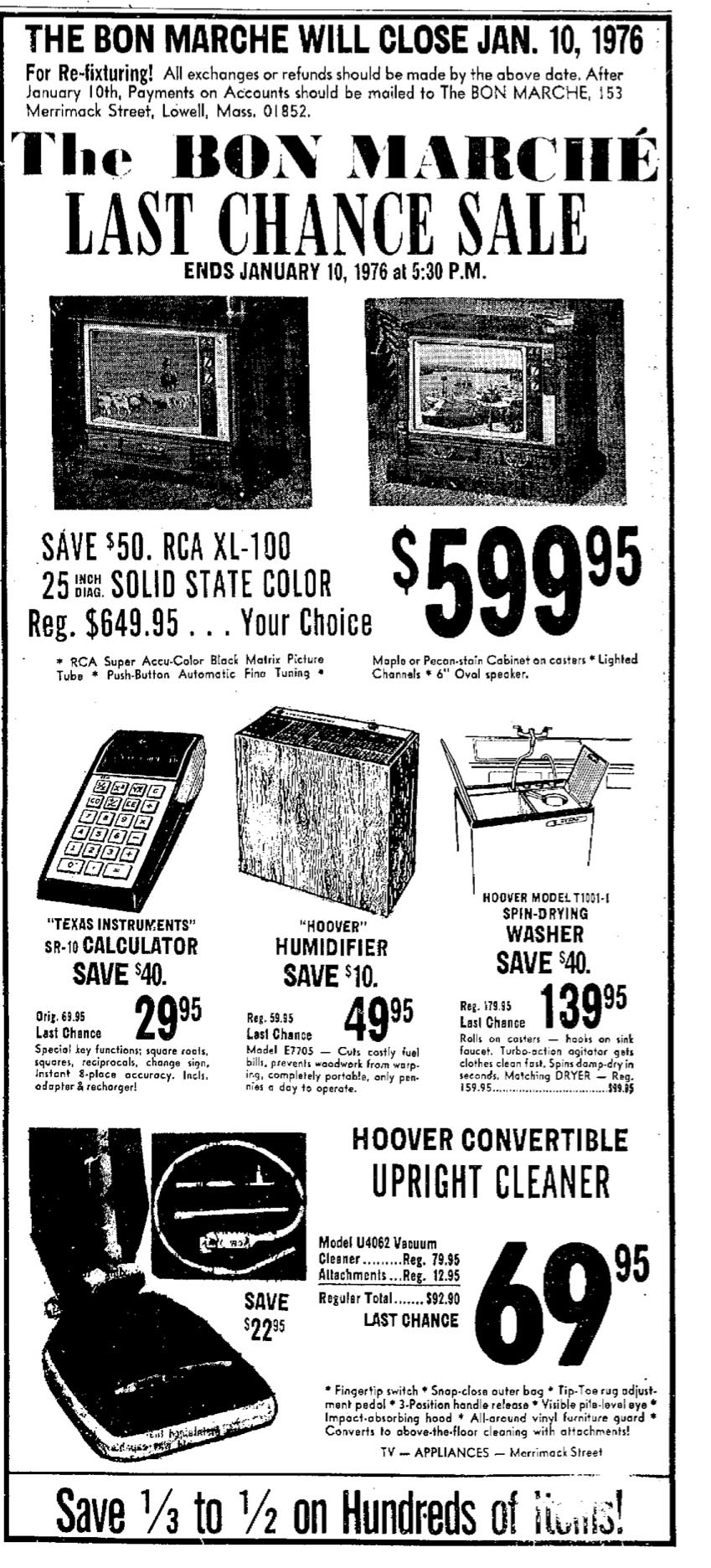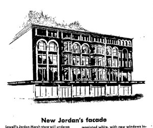 To mourn the loss of the Bon Marché Department Store in Downtown Lowell is almost like mourning the loss of a beloved grandparent.  On the day the Bon Marché closed, its faithful came out one last time to reflect on their relationship with the store, and to discuss among themselves what its loss would mean to Downtown Lowell.  As the Bon Marché prepared to close its doors for the final time at 5:30 PM on January 10, 1976, customers picked through its remaining inventory and expressed their mixed feelings about the new Jordan Marsh branch that would open in its place.  As she shopped in the Bon Marché one last time, Anita Angers told the Lowell Sun: “This is awful.  I’ve shopped here for years.  Oh, I like Jordan’s.  I go to the mall for Jordan’s, but I don’t like Bon Marché leaving.  It’s a sad day for Lowell.”  Betty Cook offered The Sun a different perspective:  “I think it’s great.  I’ve shopped here for 10 years, but I’m glad Jordan’s is coming.”