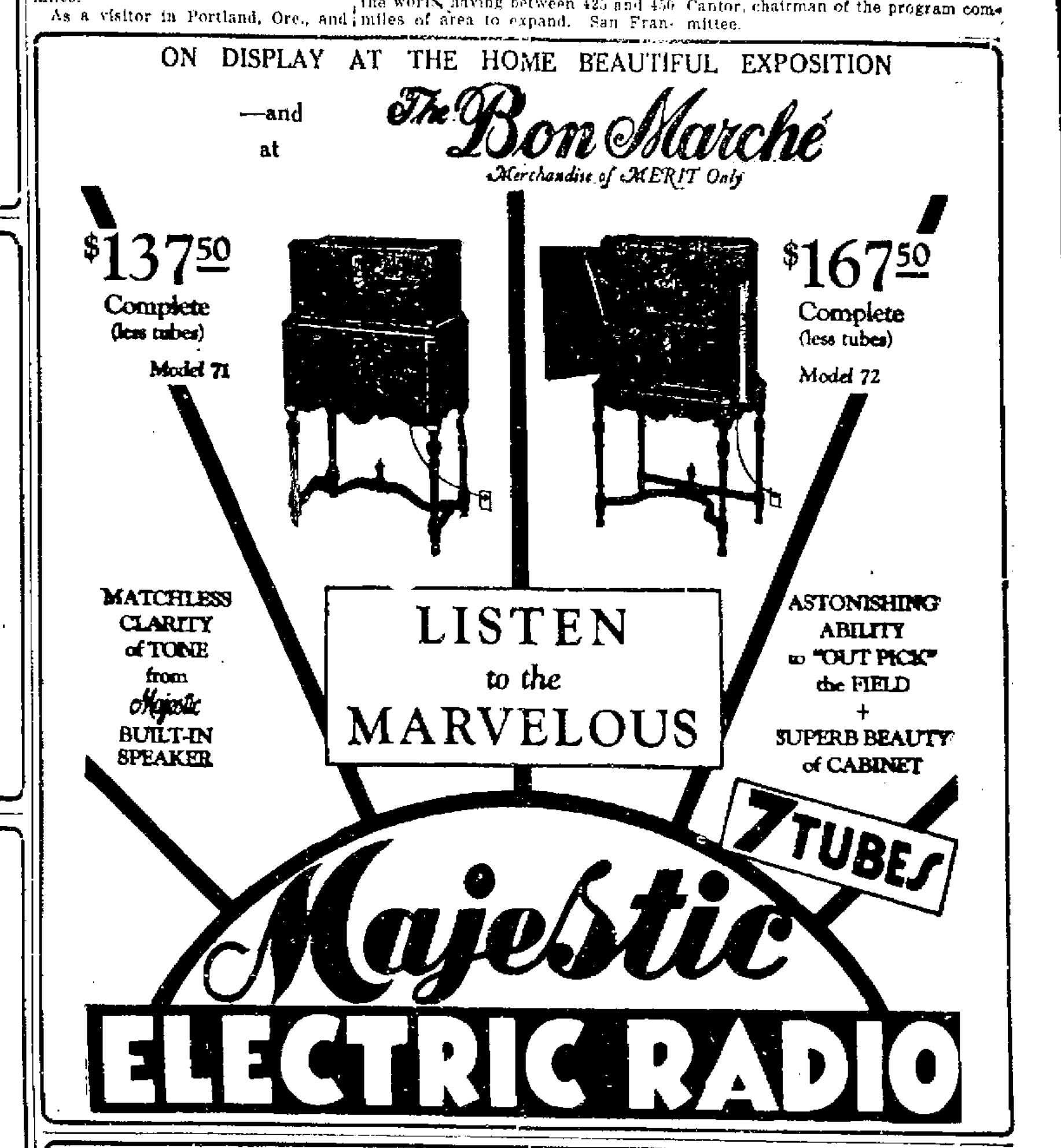 By 1928, the Bon Marché had become an established member of the Downtown Lowell retailing community and heavily touted its anniversary celebrations.  In 1928, at its fiftieth anniversary, a ten-day sale was prominently advertised in the local press.  The Bon Marché continued to sell the latest in fashions and also began to carry radios, at prices which were good for the time, but high in comparison to today’s prices.  According to the US Bureau of Labor Statistics, that $137.50 you would have spent for a radio in 1928 would set you back something north of $1,800 in today’s money.