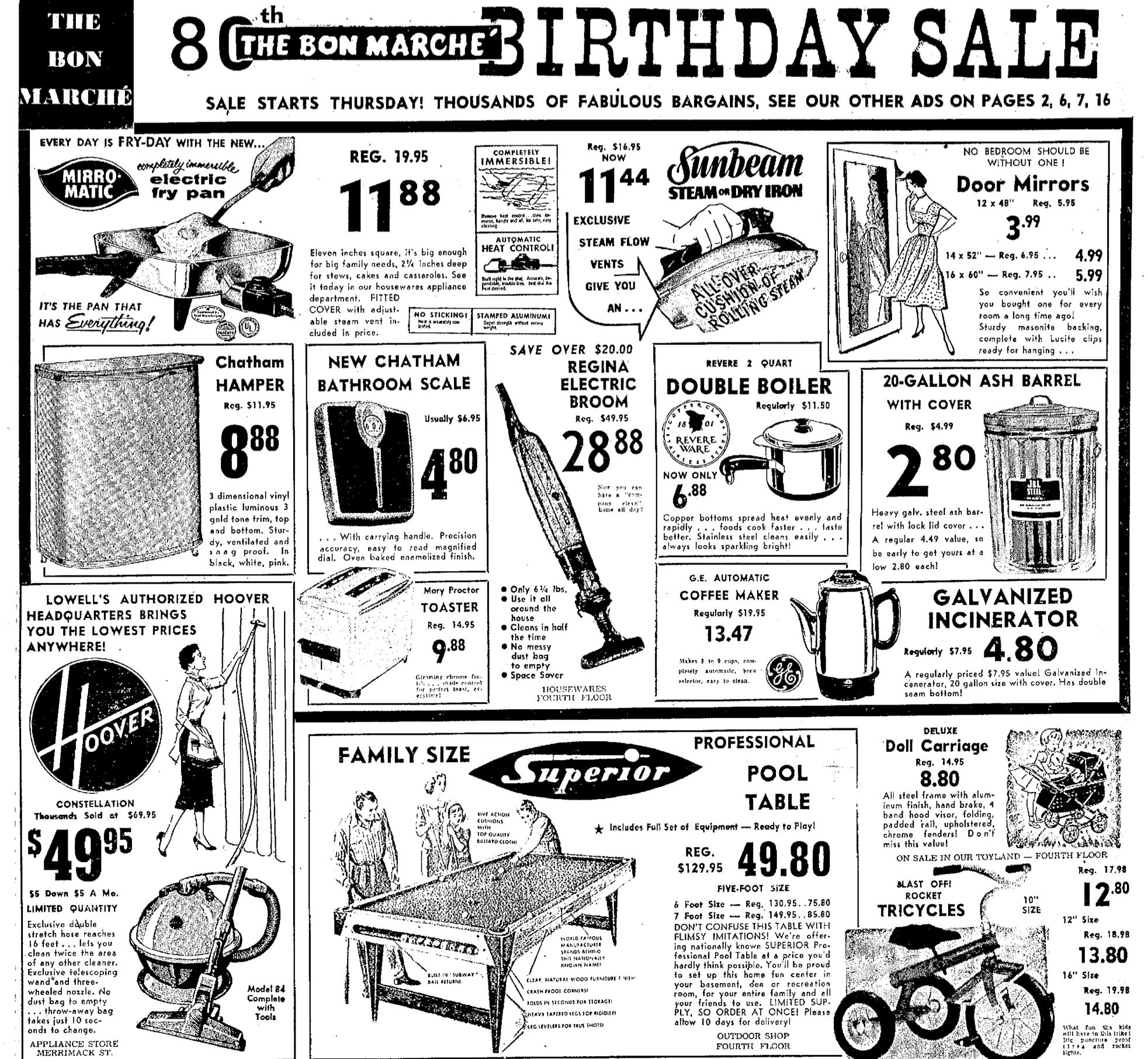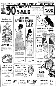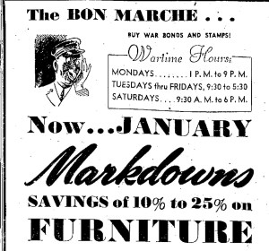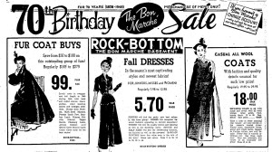 Later in the 1940’s, as the Bon Marché celebrated its 70th anniversary, the wartime business boom that had fueled increased sales slowed and sale levels returned to normal.  By the time of its 70th anniversary sale in 1948, the store heavily advertised its ‘rock bottom’ prices and the convenience offered by its charge account.
