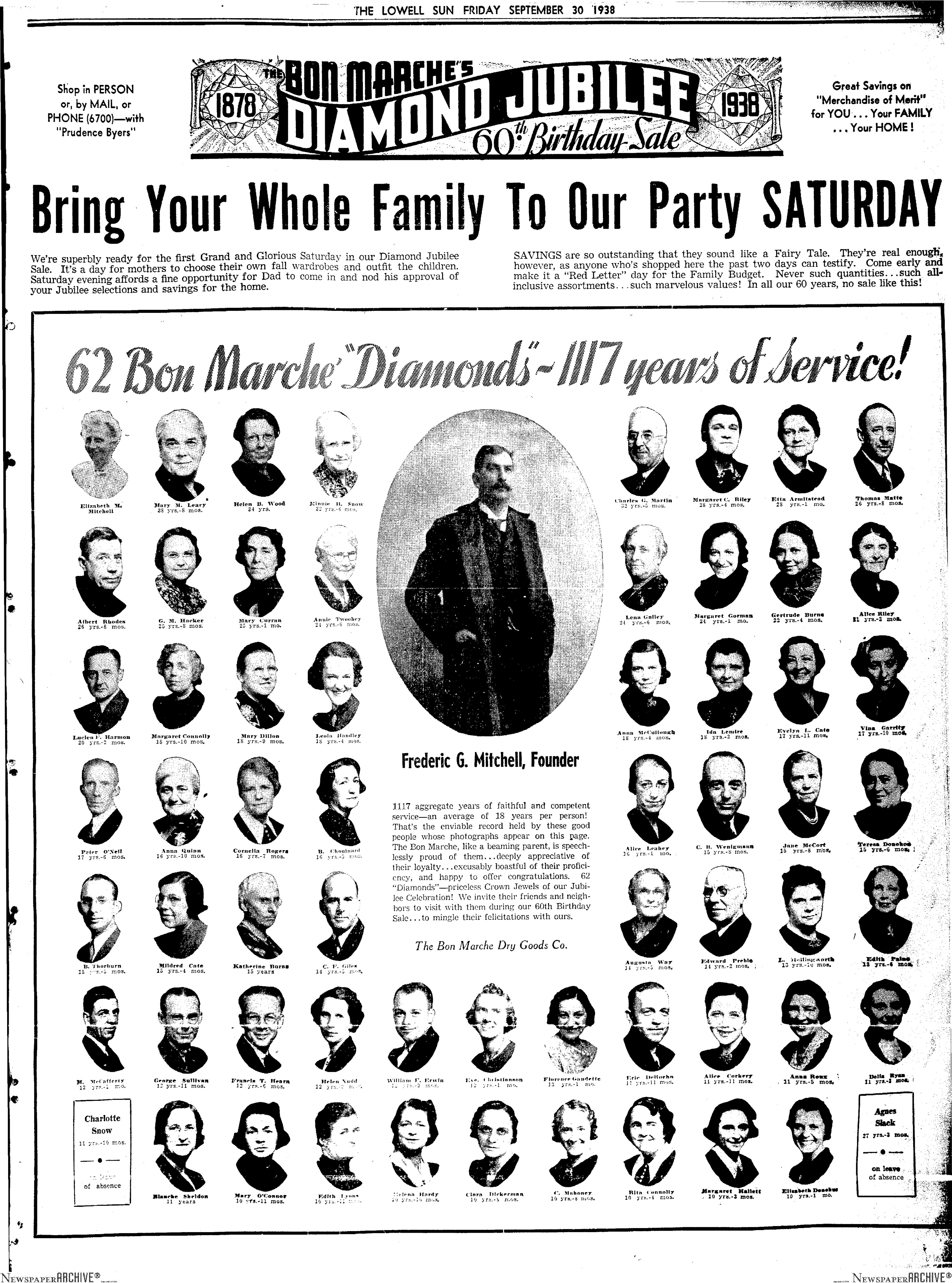 In a testament to Bon Marché as an employer and to the long-term employment mentality of the time, the Bon Marché and The Lowell Sun ran a special feature on September 30, 1938, showing all employees who had more than 10 years with Bon Marché.  There were 62.  All appear in this full-page advertisement, produced below: