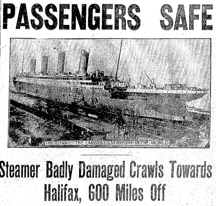 The Lowell Sun, the Boston Evening Transcript, and the Lewiston Evening Journal all reported similar headlines in their April 15, 1912 editions.