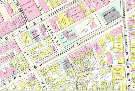 The Post Office building, located at the intersection of Lowell’s Gorham and Appleton Streets, marks the site of the original St. Peter’s Church, which had been demolished several years before this 1896 map was drawn. St. Peter’s Orphanage still stood on Appleton street, just two doors down from the original church location, at this time.