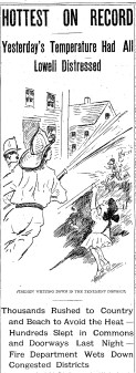 Hot spells were dangerous.  In the two-and-a-half days from Saturday to noon on Monday, 30 deaths were recorded in the Lowell area due to heat.  A significant amount, 11, were infants and children under 5 years of age.  One day later, by noon on Tuesday, 11 more had died, for a total of 41 deaths due to the heat wave.  Four more of those deaths were children under 5.  The others were older patients who doctors said would have lived, if not for the extreme heat.