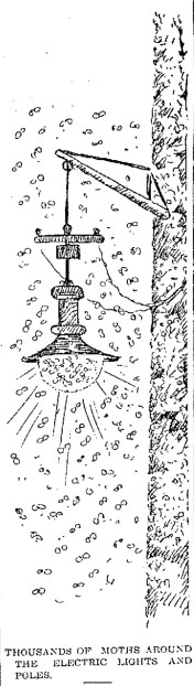 The brown-tail moths congregated on the lightposts so closely that passersby sometimes mistook the black posts as white, the color indicating stopping points for the electric car lines. (Illustration Credit: Lowell Sun – July 11, 1910)
