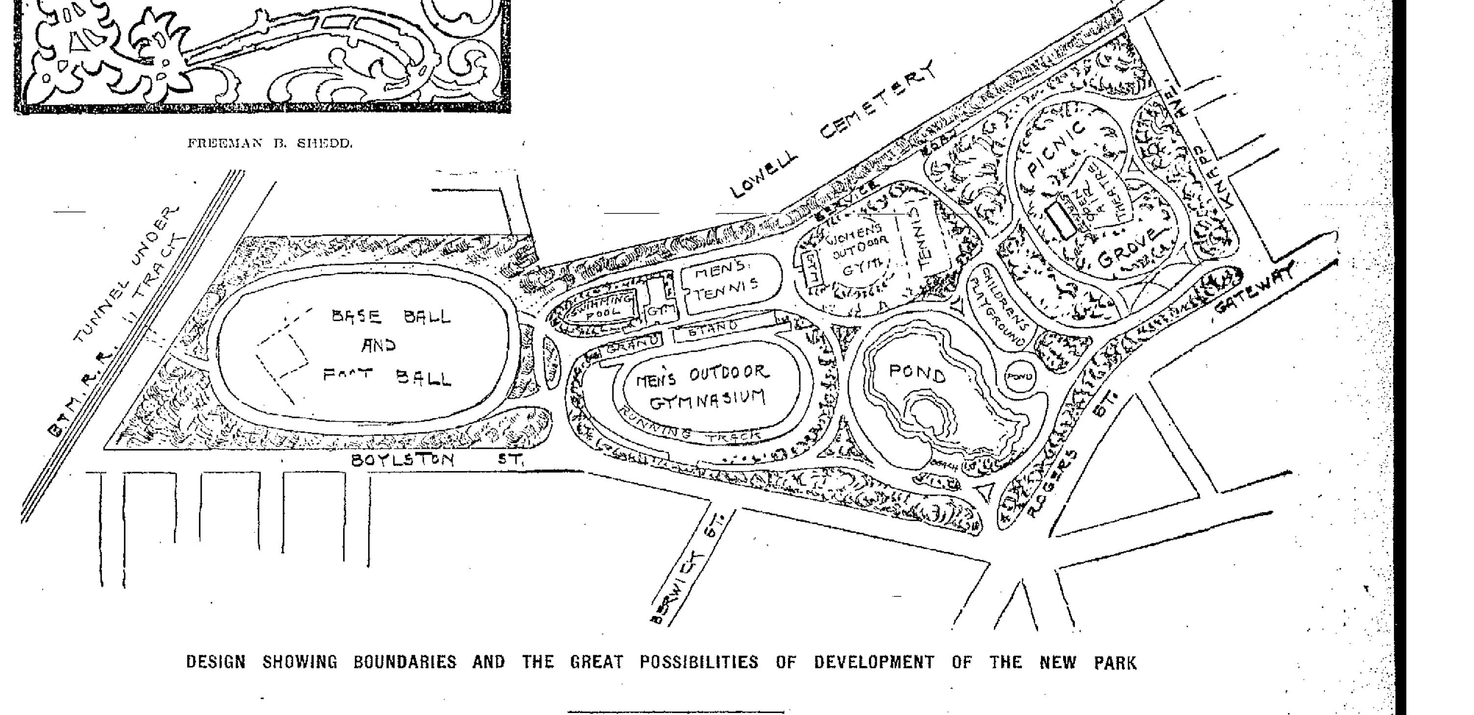 The original Bowditch plan for Shedd Park called for an open air theater, roughly where the little league baseball diamonds sit now along Knapp Avenue, a pond with a beach roughly where the Senior League baseball diamond sits now, and gender-specific gyms and tennis courts.  A field designated for baseball and football was to reside further down Boylston Street, where the current picnic area is.  Original plans also called for an underground tunnel to pass under the B&M railroad to connect the park with Wigginville, now better known as South Lowell.