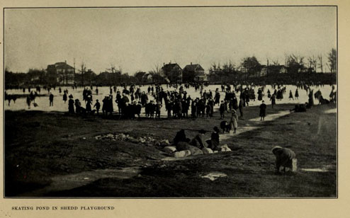 In the last days of November and into early December 1910, a 6″ inch service pipe was laid into the park, and from it approximately four million gallons of water were let onto the land to flood about five acres of land for a skating rink.  City residents loved it.  The Water Department wasn’t so thrilled.  Although the Park Department paid for the pipe and its installation, they refused to pay the water bill.