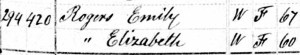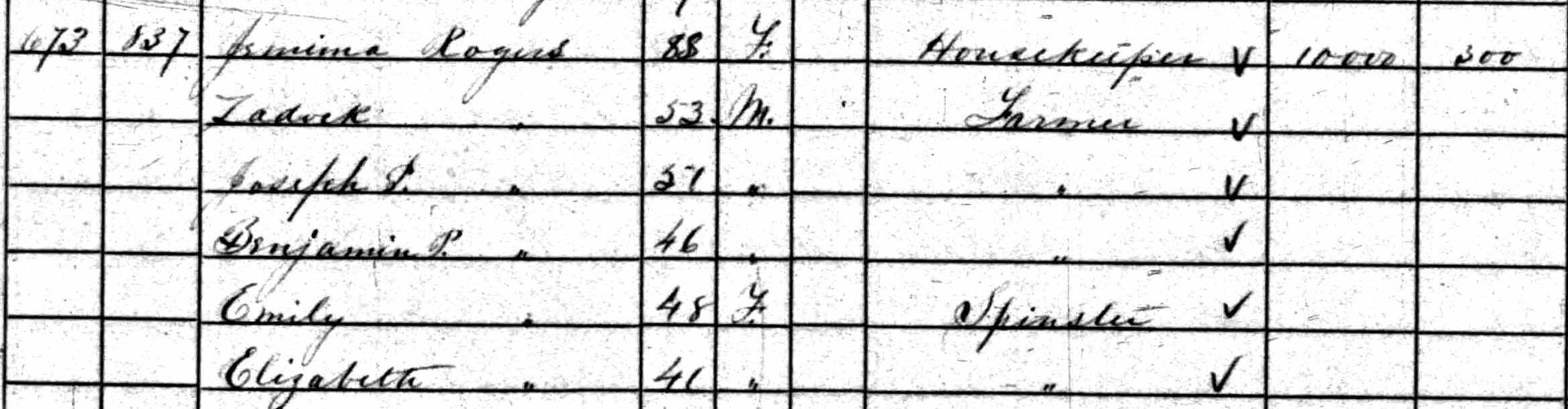 At the time of the 1860 US Census, the Rogers Family had lost its patriarch, Zadock Rogers, Sr. Emily and Elizabeth were among the youngest siblings.