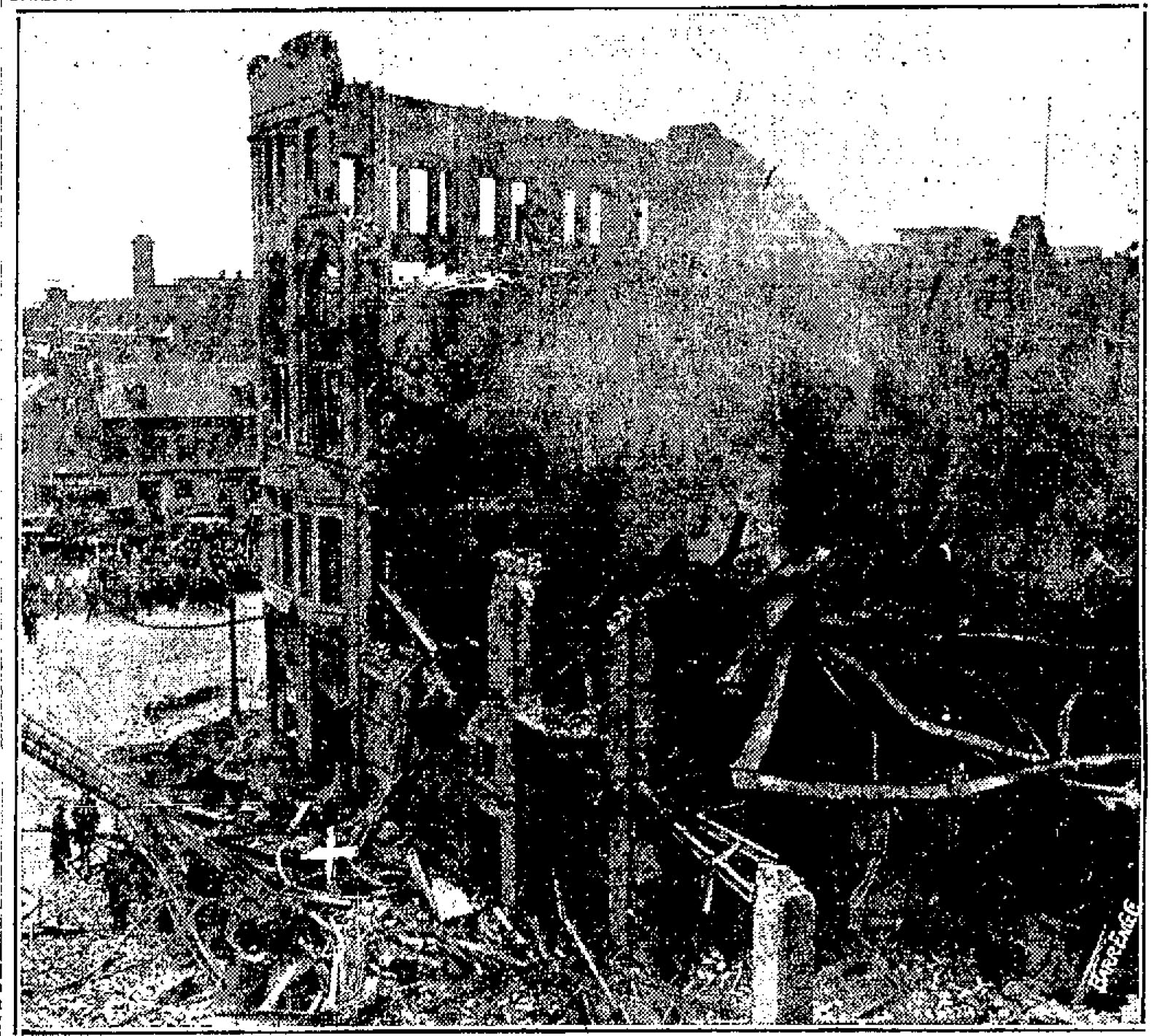 In the wake of the explosion, all men were recalled from the building. Moments after their escape, the walls and floor of the hall where they had been failed. The truck that had hoisted Capt. Cunningham’s ladder was split into two from the force of the explosion. Its engine had been crushed into its front wheels. Some men were temporarily trapped in the building. Others had to be pulled from the rubble in the street. The explosion also spread the flames far beyond the Associate Building. In moments, the Academy of Music building and Sparks’ Stable were now seriously threatened.