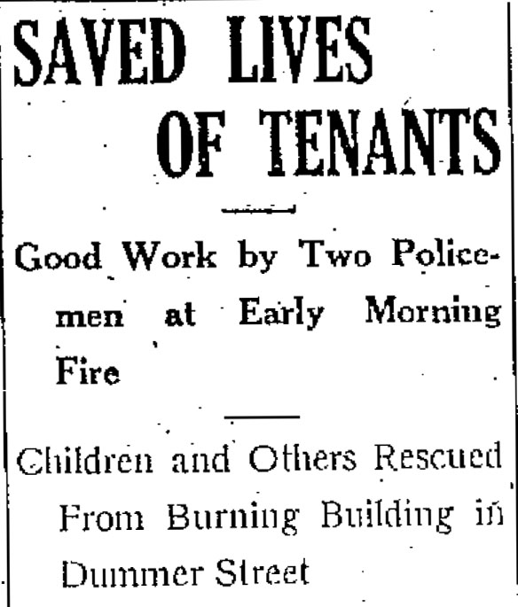 While he was wearing that very badge pictured above, Lee stood at the top of Dummer Street early one day on February 13, 1922, talking with fellow patrolman William Liston.  It wasn’t even four in the morning, when he and Liston first saw the flames and smoke bursting from the windows of a dry goods store on the ground floor of a building housing eight tenements.  Lee ran at once and pulled the alarm on a nearby fire box, while Liston ran to the burning tenement at 67 Dummer Street and started to rouse its residents.  Lee soon joined.  They, with the firemen who soon arrived, entered the building and awakened the tenants who lived on its three floors.  Everyone escaped unharmed, and the men carried three children out of the fire to safety.