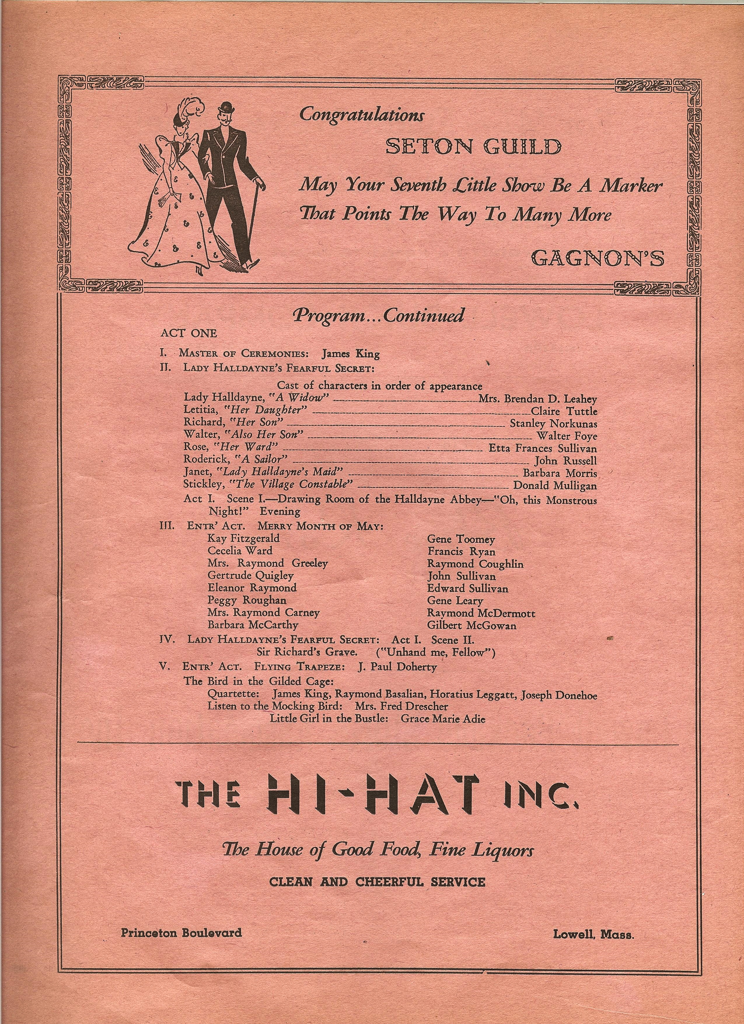 The Hi Hat started out a generation earlier, as a restaurant, back in the midst of the Great Depression, when it was owned by Wilfred Goodnow. As early as 1931, advertisements appeared in the Lowell Sun for the Hi-Hat Food Shoppe on Princeton Boulevard. Even in these earliest days, during the Goodnow years, the Hi-Hat kept late hours, and was open till 1 AM. As the ad proclaims, ‘Noon lunch in our cozy dining room will surprise you.” By 1940, it had added a dance hall. The Hi-Hat was quiet in its early years. Its frequent ads in the Lowell Sun touted its fried clams and other food. After the mid-30s, liquor began to appear in its ads too.