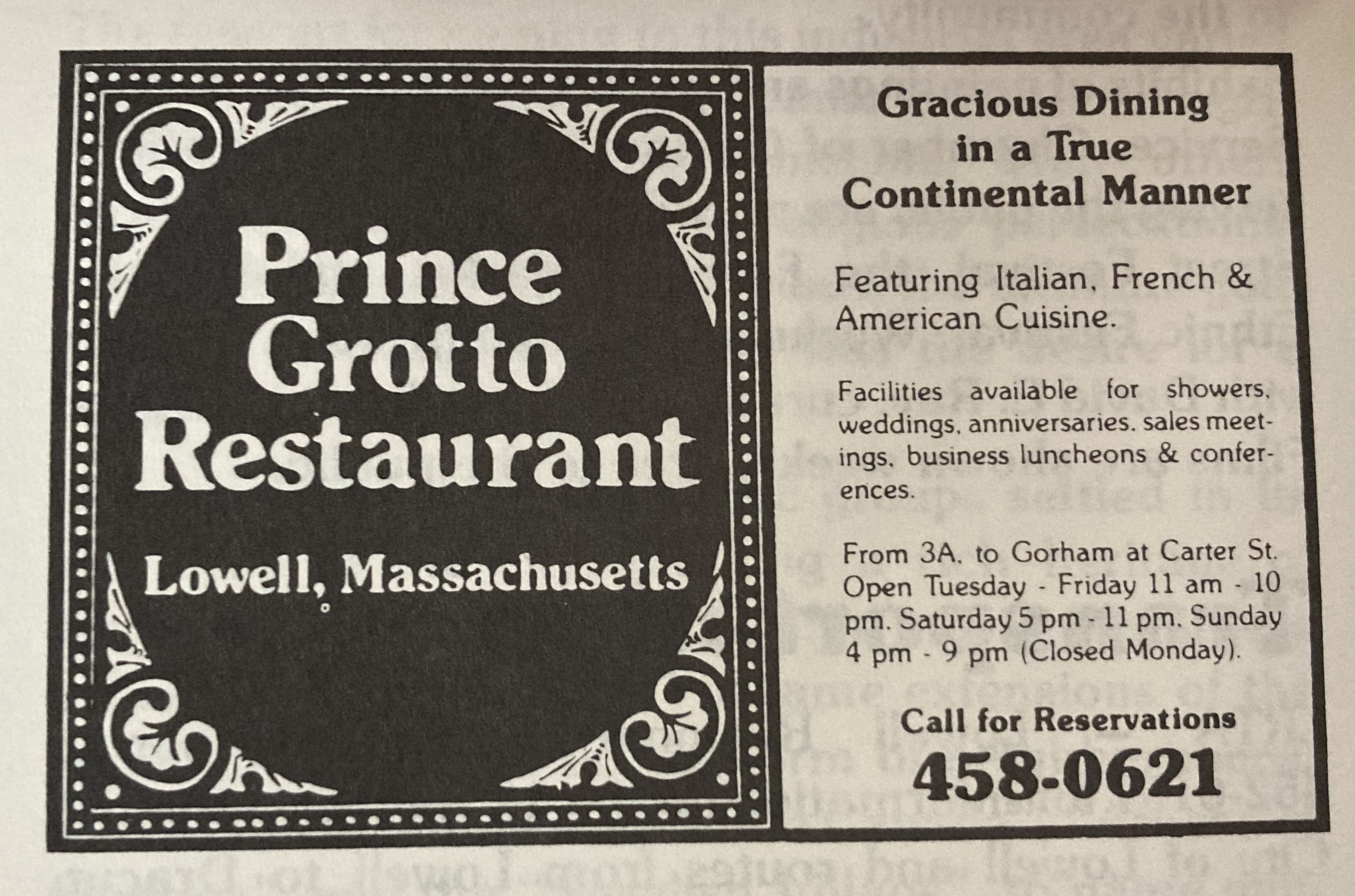Lowell came to know the Prince Grotto for dishes like Shrimp Scampi, Eggplant Parmigiana, Lobster-Stuffed Chicken Breast, Veal Scallopine a la Marsala, and its Prime Rib. Many in Lowell sipped their first cappuccino at the Prince Grotto as they took in the carefully constructed ambiance inside the restaurant and its well-tended gardens outside.