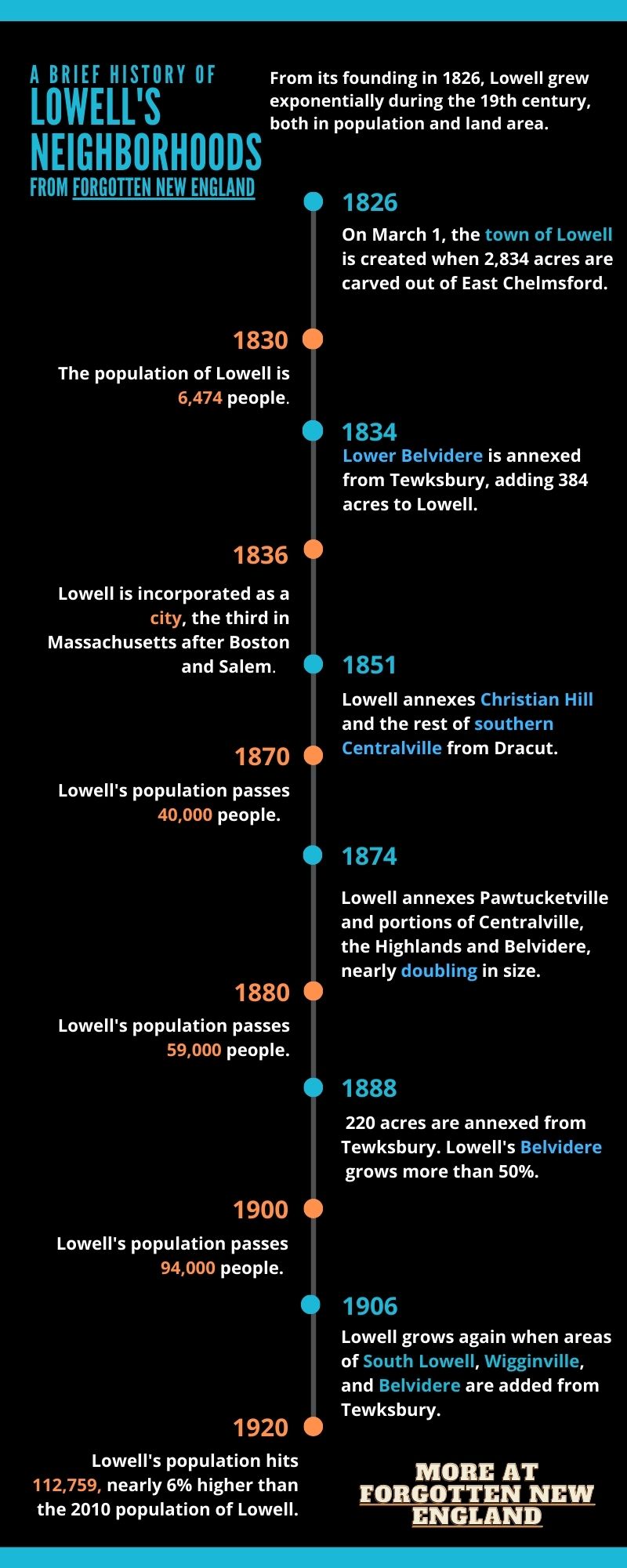 Lowell’s last two annexations came from Tewksbury’s land. The 1888 annexations grew Lowell’s Belvidere neighborhood by more than 50%. Belvidere grew again in 1906, along with South Lowell and Wigginville. Just a few years later, in 1920, Lowell’s population grew to 112,759 people, more than 5% higher than its population in the 2010 US Census.